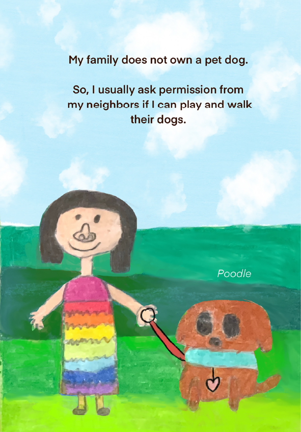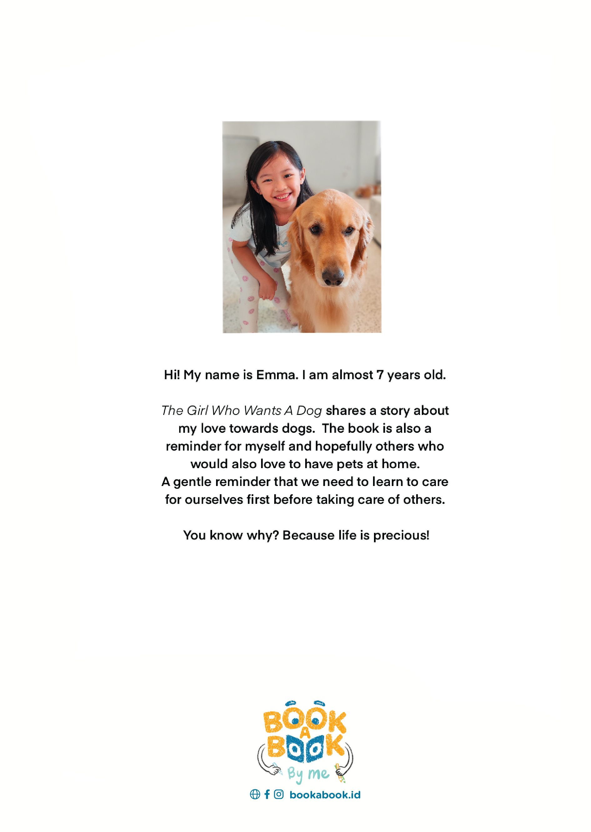 Hi! My name is Emma. I am almost 7 years old. The Girl Who Wants A Dog shares a story about my love towards dogs. The book is also a reminder for myself and hopefully others who would also love to have pets at home. A gentle reminder that we need to learn to care for ourselves first before taking care of others. You know why? Because life is precious!