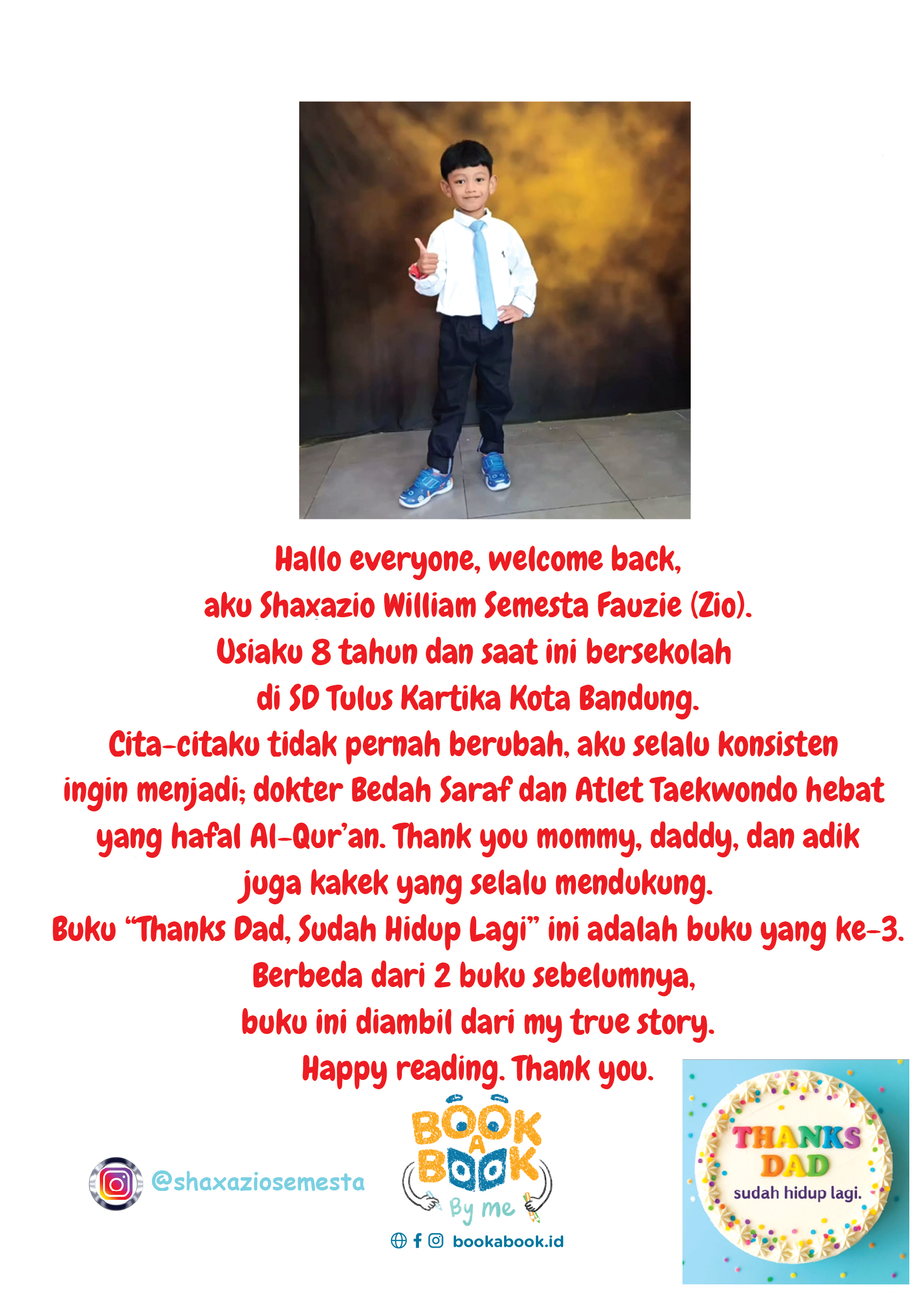 Hallo everyone, welcome back, aku Shaxazio William Semesta Fauzie (Zio). Usiaku 8 tahun dan saat ini bersekolah di SD Tulus Kartika Kota Bandung. Cita-citaku tidak pernah berubah, aku selalu konsisten ingin menjadi; dokter Bedah Saraf dan Atlet Taekwondo hebat yang hafal Al-Qur’an. Thank you mommy, daddy, dan adik juga kakek yang selalu mendukung. Buku “Thanks Dad, Sudah Hidup Lagi” ini adalah buku yang ke-3. Berbeda dari 2 buku sebelumnya, buku ini diambil dari my true story. Happy reading. Thank you.