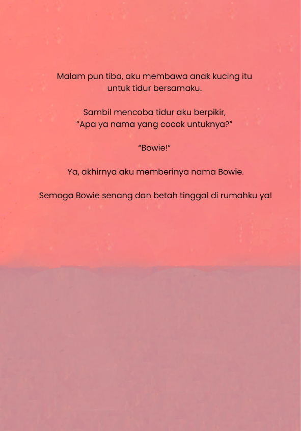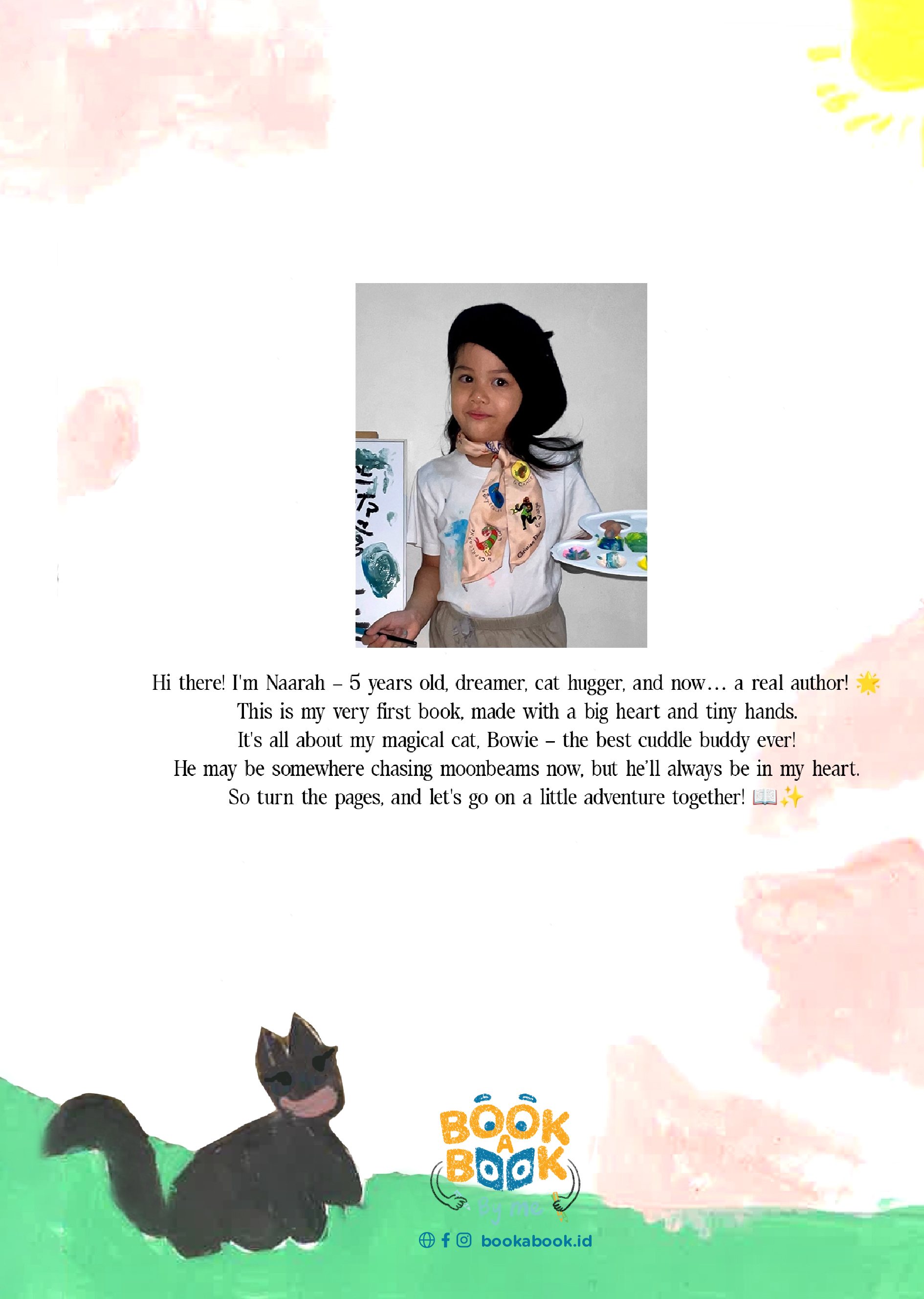 Hi there! I'm Naarah — 5 years old, dreamer, cat hugger, and now… a real author! 🌟 This is my very first book, made with a big heart and tiny hands. It's all about my magical cat, Bowie — the best cuddle buddy ever! He may be somewhere chasing moonbeams now, but he’ll always be in my heart. So turn the pages, and let's go on a little adventure together! 📖✨